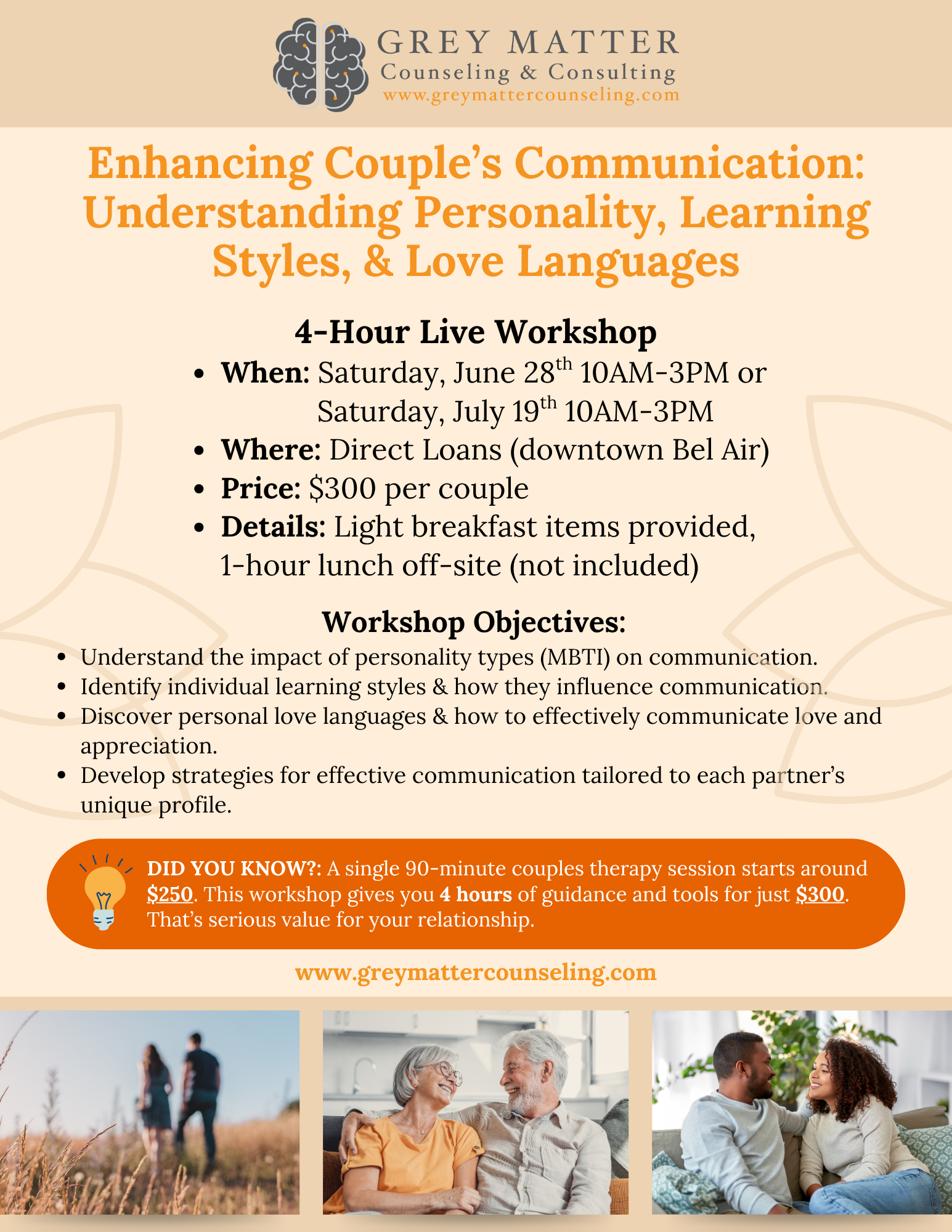 💡 DID YOU KNOW?: A single 90-minute couples therapy session starts around $250. This workshop gives you 4 hours of guidance and tools for just $300. That’s serious value for your relationship! 🧠